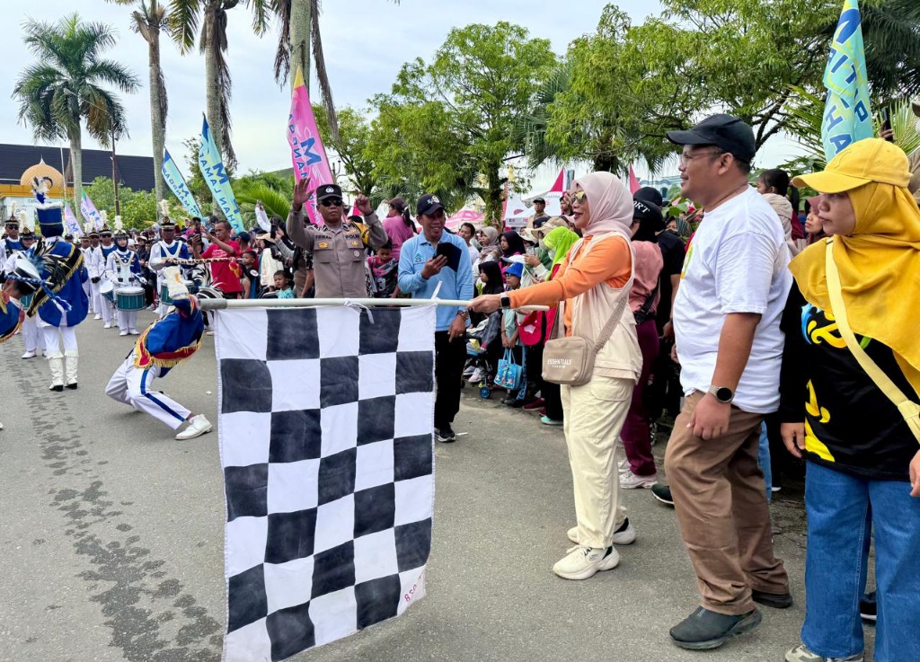 Neny didampingi Camat Ruddy melepas ribuan peserta jalan sehat yang antusias merayakan HUT ke-129 Kota Balikpapan.